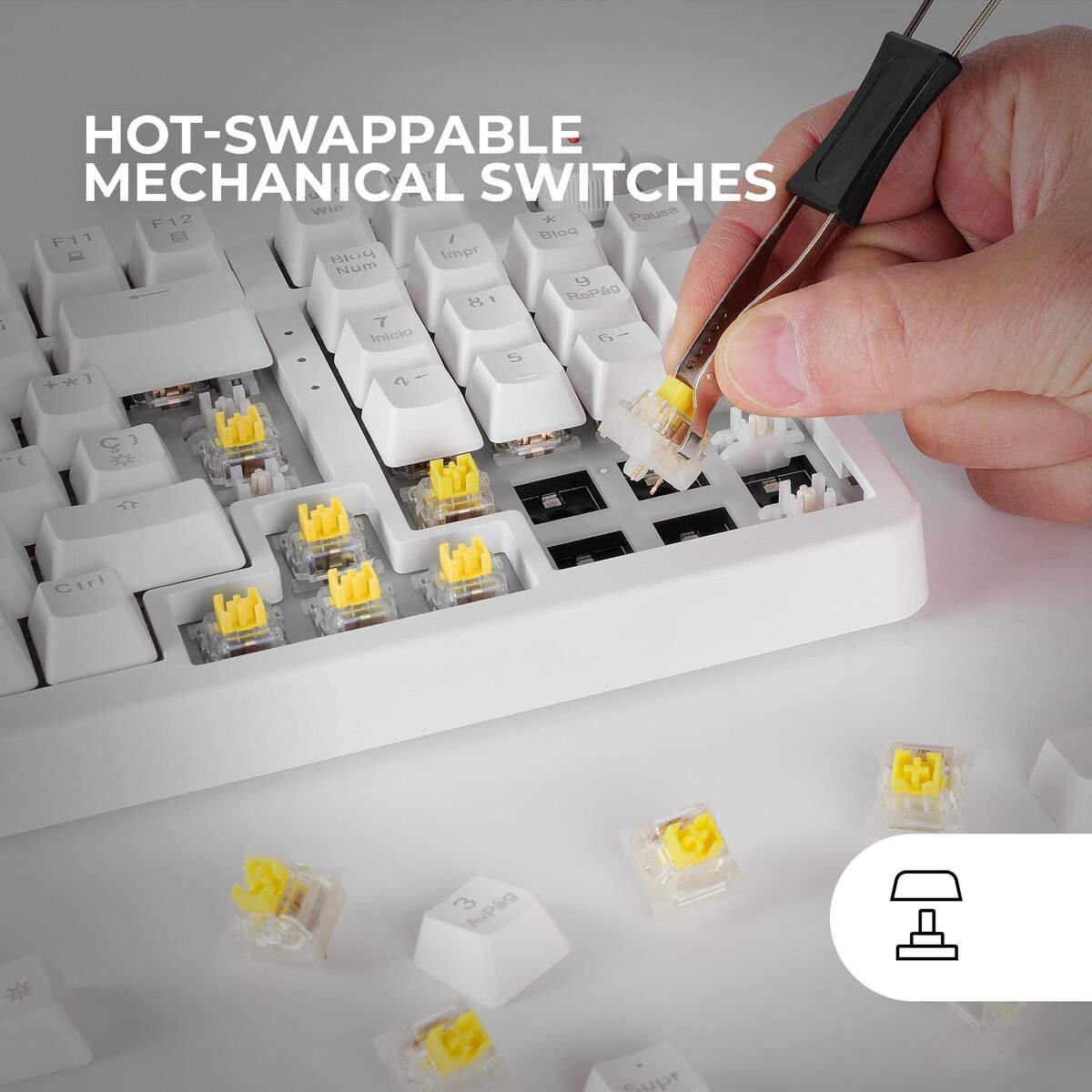 The MKPROWYES gaming keyboard by Mars Gaming is a device designed to deliver a professional and complete experience in gaming and productivity, featuring a compact layout with 97 keys including a numeric keypad, ideal for users needing a functional setup without sacrificing versatility. It has a structure made of ABS, a durable material ensuring long life with an estimated lifespan of up to 50 million keystrokes. Its mechanical technology includes SNK switches in two variants, blue and yellow, both with a fast actuation point at 2 mm, where blue requires 60 grams of force and yellow 50 grams, allowing precise and tactile response optimized to user preference. This keyboard connects via USB 2.0 with a 150 cm rubber-coated cable for enhanced durability and flexibility. It also features an RGB Chroma lighting system capable of displaying 16.8 million colors, with double-injection backlit keys that improve visibility and aesthetic customization, highly valued in gaming setups. The keyboard includes full anti-ghosting technology to ensure correct simultaneous key registration, essential for intense gaming sessions and complex commands. With a polling rate of 1000 Hz, communication with the computer is fast and smooth, minimizing input lag. It is compatible with multiple operating systems, including Windows, Linux, Mac, and consoles like PS4, PS5, Xbox One, Xbox Series X-S, and Nintendo Switch, although some functions may be limited depending on the system used. Its ergonomic and compact design, measuring 385 x 140 x 40 mm and weighing only 750 grams, makes it comfortable for long use sessions without added fatigue. In short, the Mars Gaming MKPROWYES is a mechanical keyboard that combines efficiency, durability, and customizable lighting, suitable for users who need a robust, responsive, and adaptable device for both gaming and work.